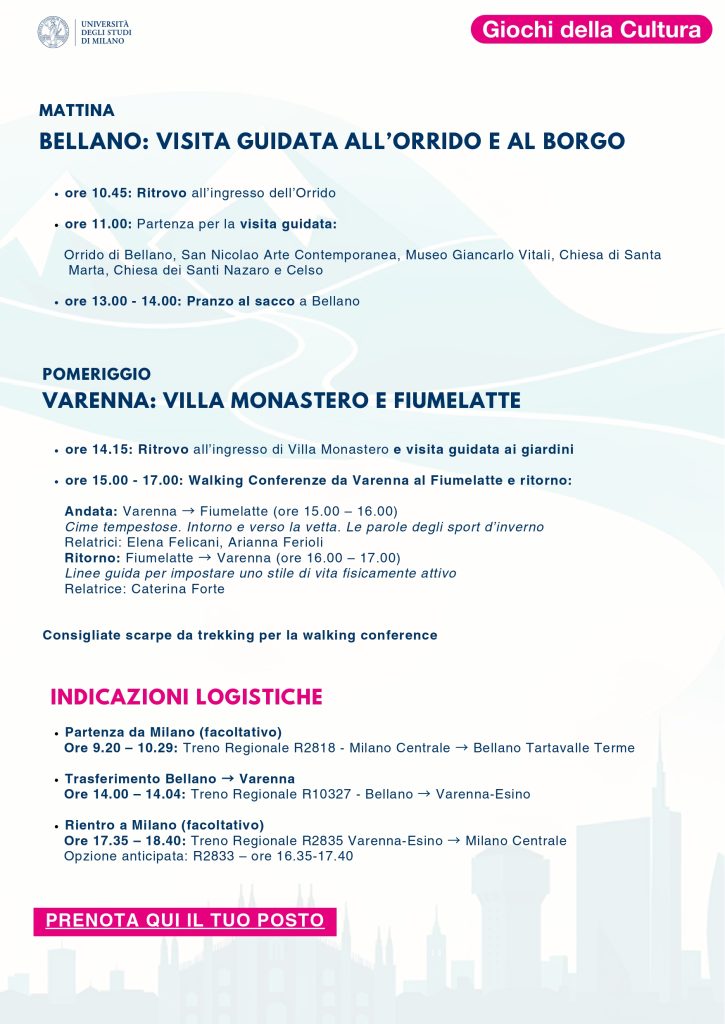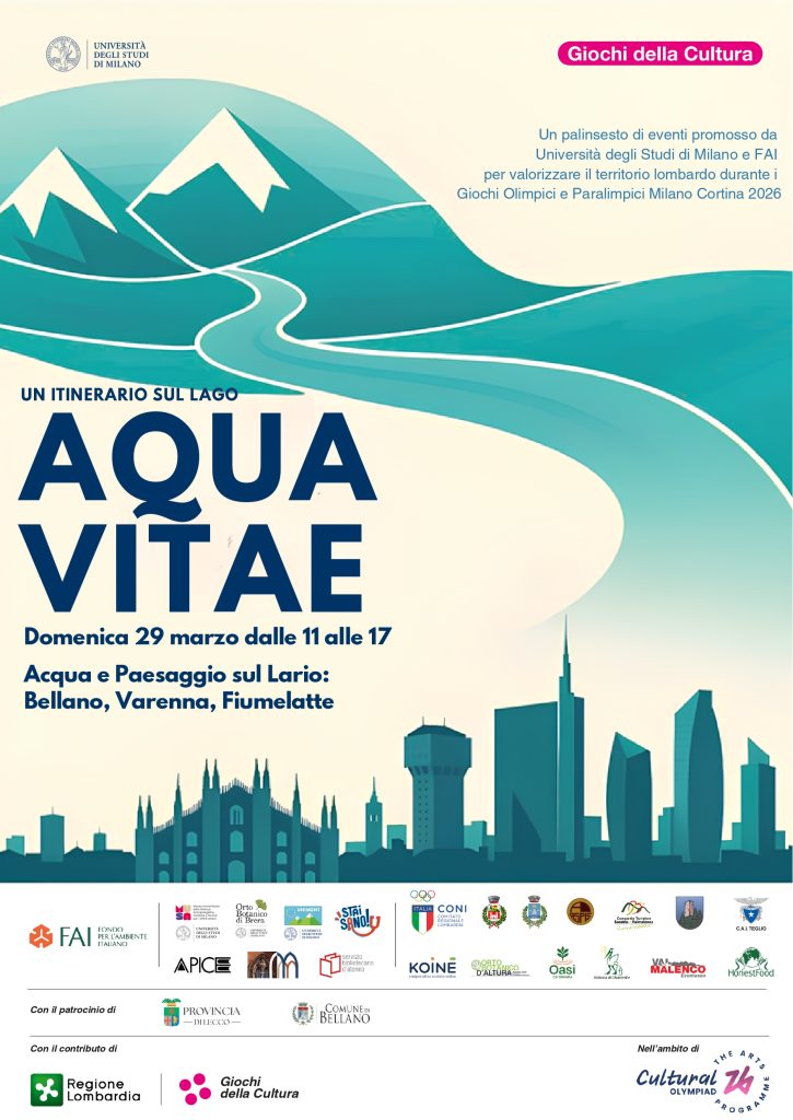Nell’ambito di Aqua Vitae, l’Università degli Studi di Milano organizza una giornata di attività a Bellano e Varenna, a cura dei docenti di Scienze Motorie e di Storia dell’Ateneo. L’iniziativa prevede una visita guidata a Bellano e, a seguire, una walking conference da Varenna a Fiumelatte, con visita ai giardini di Villa Monastero.