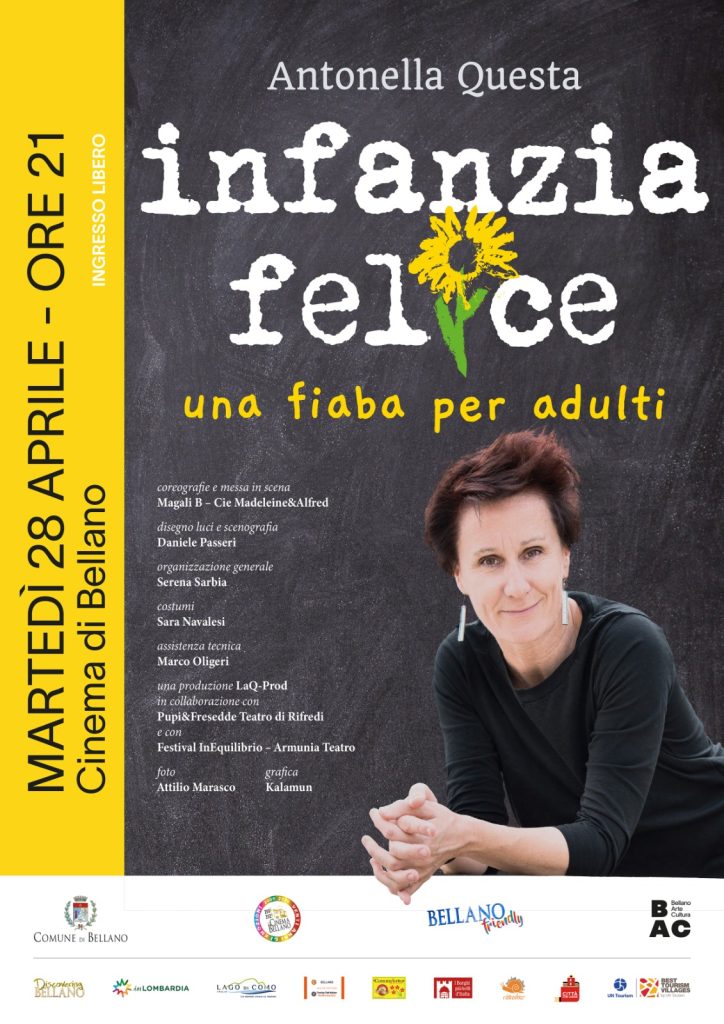 Il primo evento in programma è lo spettacolo “Infanzia Felice”, di e con Antonella Questa, in scena il 28 aprile alle ore 21.00 al Cinema di Bellano con ingresso gratuito senza prenotazione fino a esaurimento posti.